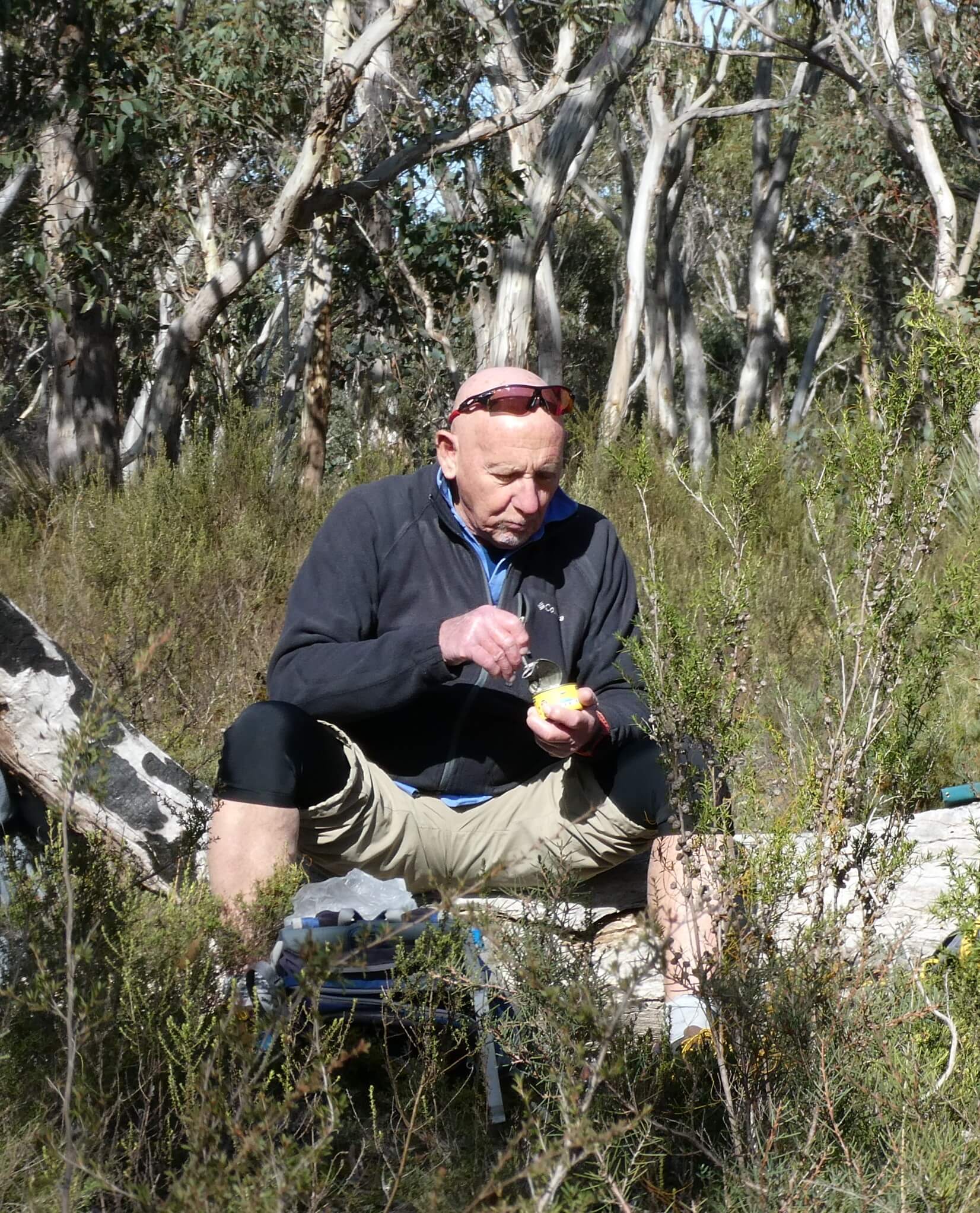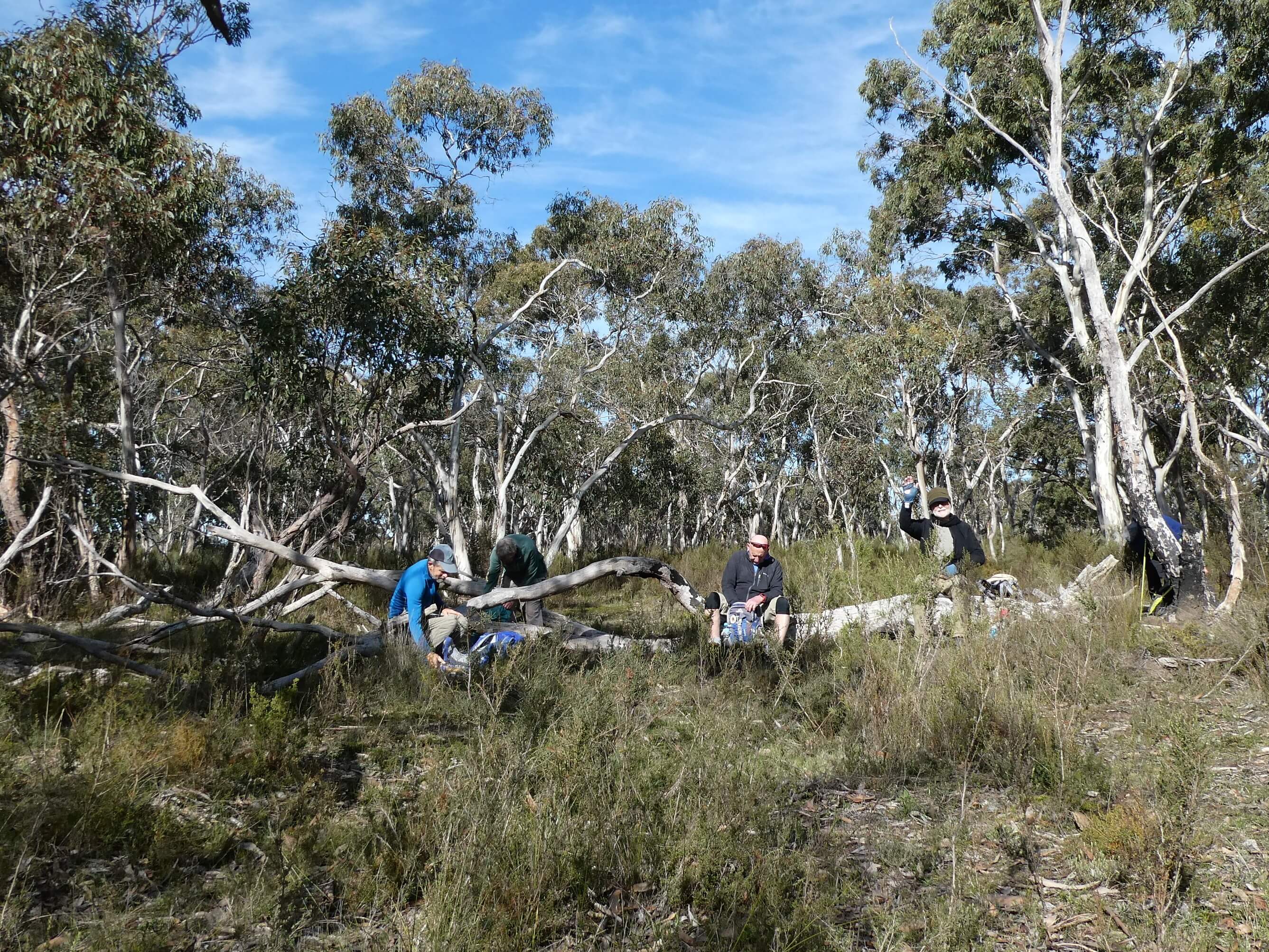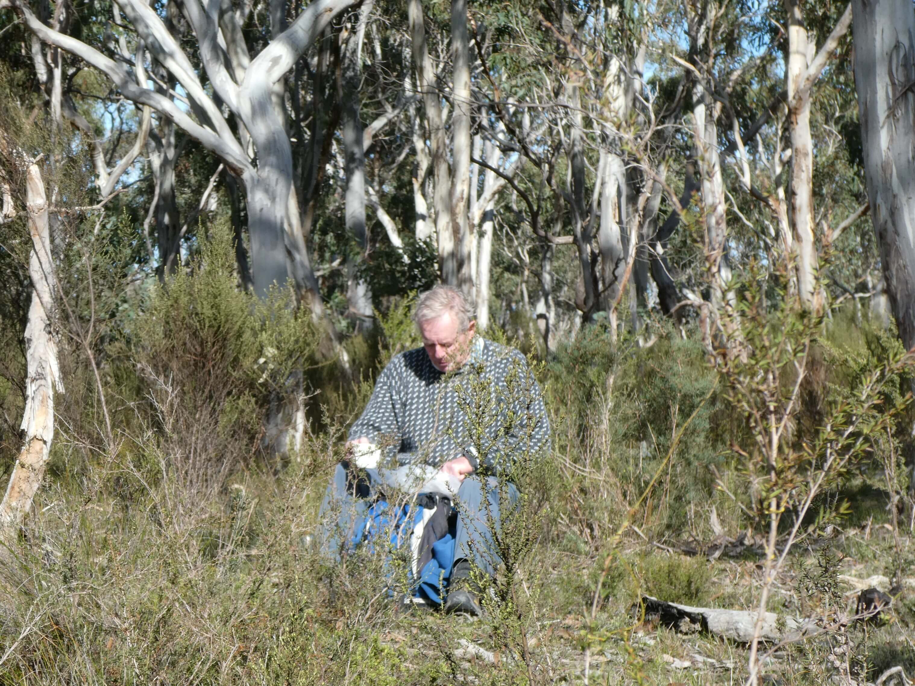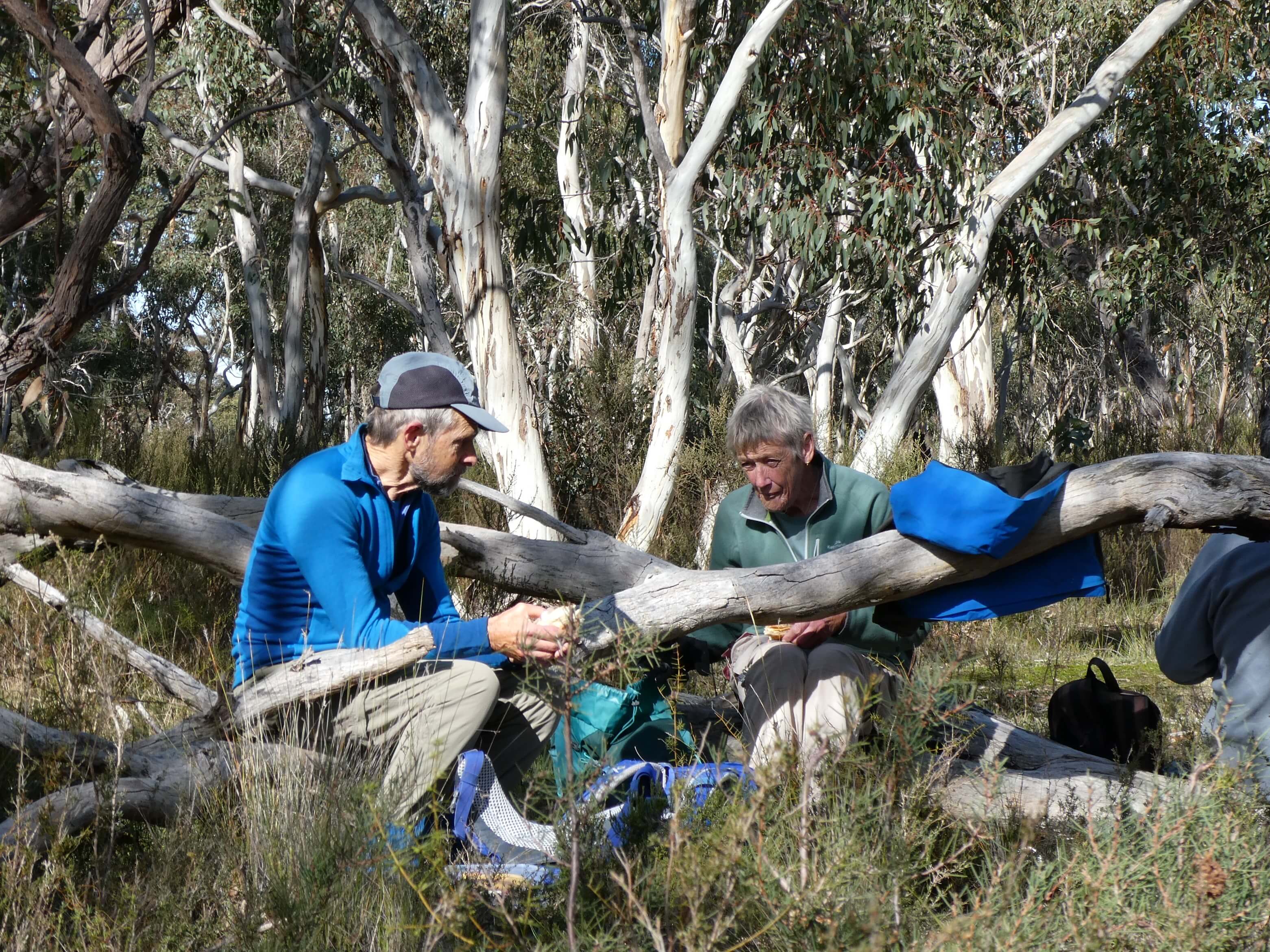 For our morning tea we perched at the side of the track,like a row of sparrows on a power line, but for us it was on a dirt ledge at about the right height for sitting.