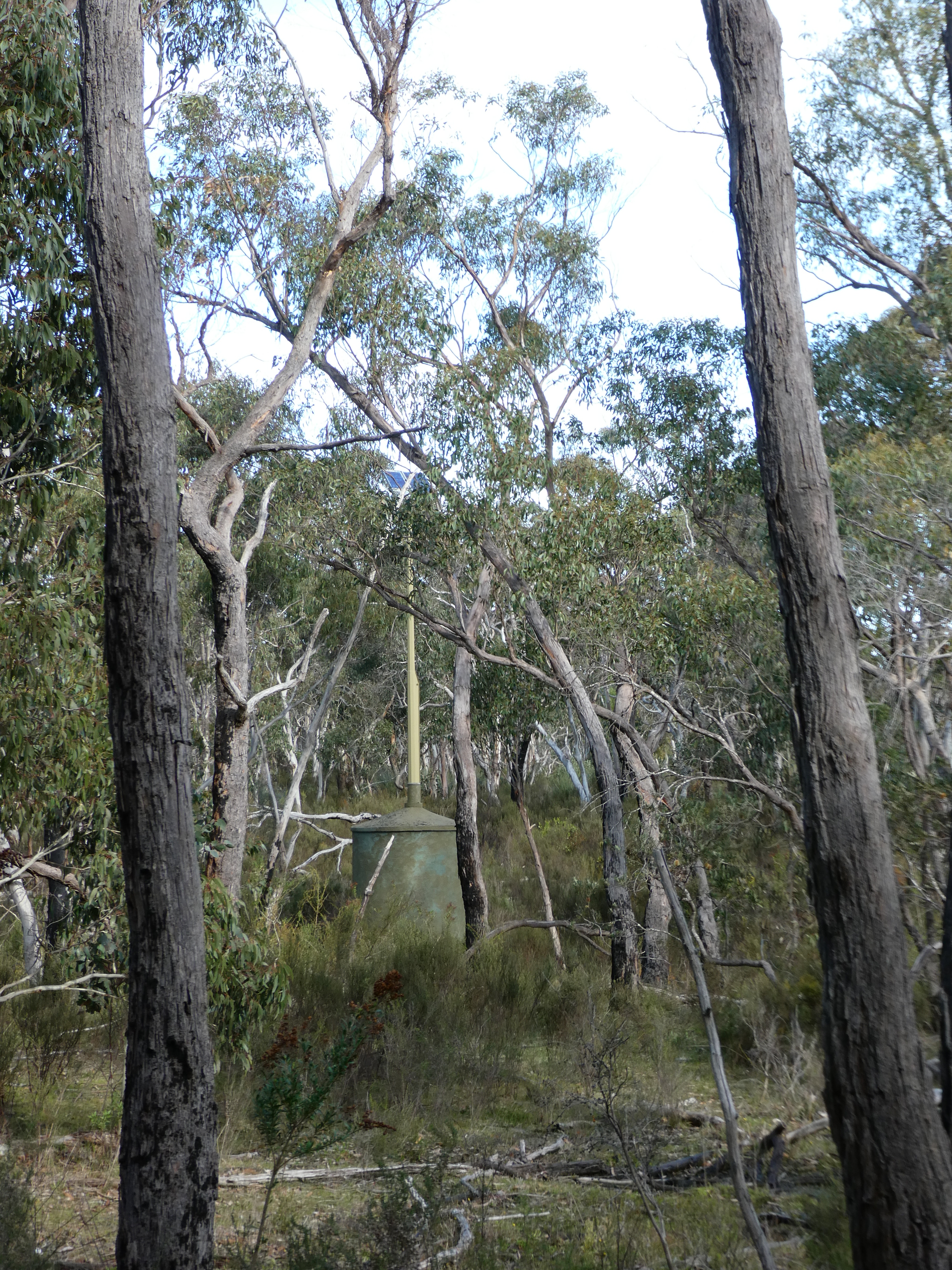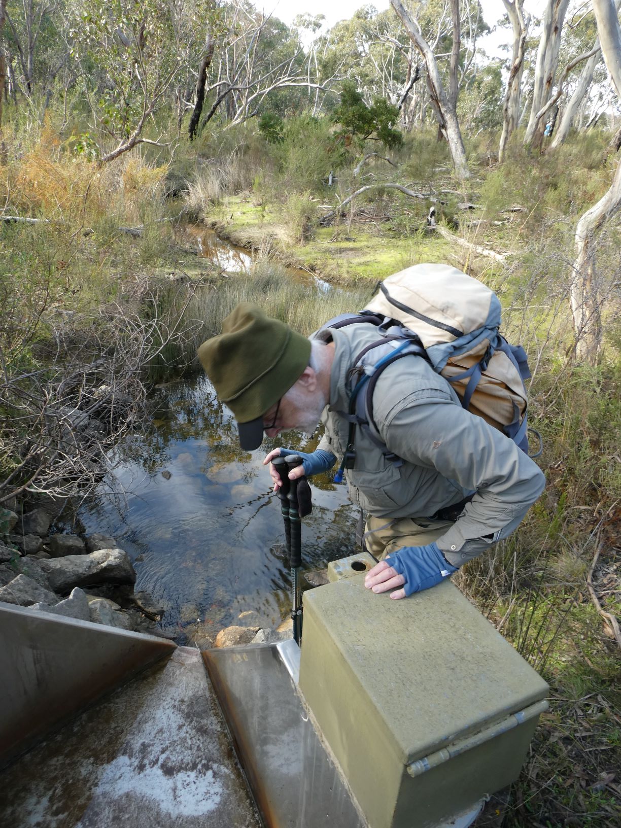 before heading onwards across the creek. The group eventually agreed that the structure discovered was probably a water height recorder (first photo below), which was near a green tank-like structure (second photo below) with door and solar power on pole which stands beside the creek, where the small “spillway” with monitoring box are sited.
