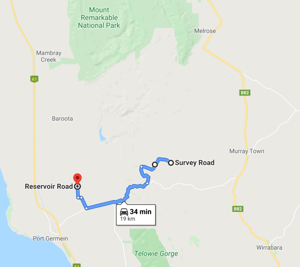 From Melrose take Survey road heading south out of town. There is a brown sign on the corner of Searle St (which turns into Survey Rd) and Horrocks Highway. Follow the road out of town for about 15km. Turn right onto the Bridle track and open the first of five gates.